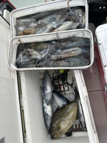 9/14 マルゴ75cm ハマチ大 ヒレナガカンパチ スマ小30匹位 イサキ キジハタ アオリイカ95杯