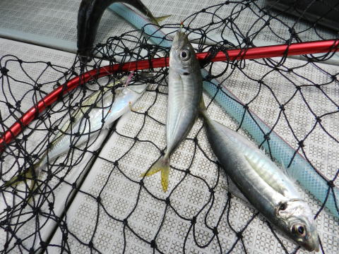 中盤は落とし込みでアジを釣り、美味そうなのはキープして小アジでノマセ。