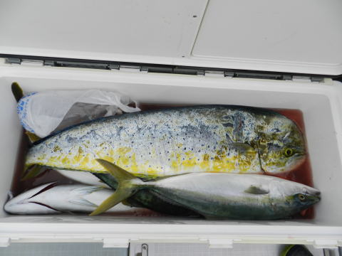 後半戦は潮が、かなり早くて魚は俄然、御機嫌。青物以外にもシイラの90cm位のオスと